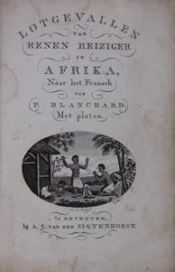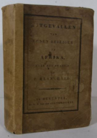 BLANCHARD, Pierre. Lotgevallen van eenen reiziger in Afrika. Naar het Fransch. Deventer, A.J. van den Sigtenhorst, (1828).Sm.8vo. Original printed boards (spine rep.), uncut. With engraved title-vignette and 3 engraved plates after G.H. Göbell by A. van de Beek. IV,263 pp. Story for children narrated by the traveller Mr. Vilmard. A large part is dealing with the slave-trade in Africa. - (Age-browned). [Boeknr.: 20337 ]