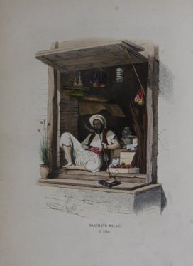 MATHAREL, Victor de. Vues des provinces d'Alger, de Constantine et d'Oran. Paris, Gihaut Frères, (1841).2 volumes. Oblong folio. Original pictorial lithographed wrappers (some fraying). 12 tinted lithographed views by Victor de Matharel, printed by Lemercier, Bernard et cie. Ca. 36 x 55 cm. Twelve superb views of Algeria: Mazagran - Mostaganem, fort des Cigognes - M. Silah, ville du Saarah -Saïda, fort d'Abd-el-Kader - Bougie - El-Kantara a Constntine - Alger - Medeah, province de Titerie - Oran, vue prise de la marine - Marabout près Mascara - Sidi Yacoub près d'Alger - Bône, des ruines d'Hippone. - (Some light foxing in blank margins). - A fine and rare set of large views of Algeria. [Boeknr.: 36236 ]