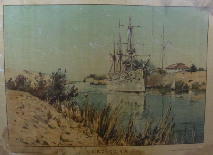 SUEZ CANAL. Suez Canal. Troopships passing through. London, Edinburgh, T. Nelson & Son, (ca. 1920).Coloured schoolplate mounted on board. Ca. 56 x 74 cm. The Royal Portfolio, Geographical Series. - (Waterstained). [Boeknr.: 37955 ]