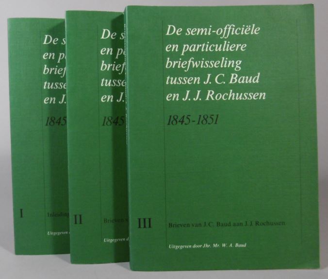 BAUD, J.C. & J.J. ROCHUSSEN. Semi-officiële en particuliere briefwisseling tussen J.C. Baud en J.J. Rochussen 1845-1851 en enige daarop betrekking hebbende andere stukken. Uitgegeven door W.A. Baud. Assen, Van Gorcum, 1983. 3 volumes. Wrappers. With maps and portraits. XIV,242; 407; 308 pp. Correspondence between a minister and governor general: Jean Chrétien baron Baud (1789 - 1859) and Jan Jacob Rochussen (1797 - 1871) . [Boeknr.: 22625 ]