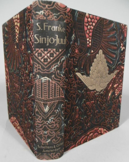 FRANKE, S. Sinjo-Juul. Amsterdam, Scheltens & Giltay, (1939). Original imitation batik binding with gilt garuda on frontcover (spine discoloured). 295 pp. First edition. - Juvenile set on Java with as main character an Eurasian boy. Dutch imitation batik, produced by the Leidsche Katoenmaatschappij (1836-1936) was used during the beginning of the 20th century for book bindings. - Fine.Buur, Indische jeugdliteratuur 0723; See Kasper van Ommen. Leidse katoentjes vs. Javaanse batik. (De Boekenwereld Jrg. 34, 4). [Boeknr.: 35517 ]
