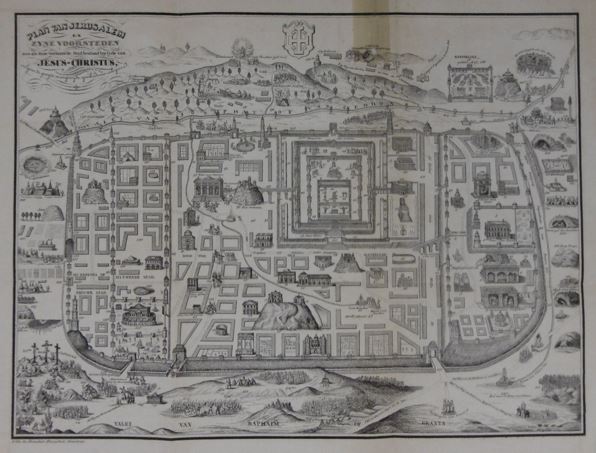 VRIEZE, C.L. de. Korte beschryving van de stad Jerusalem, benevens hare voorsteden, zoo als deze bestond ten tyde van O.H. Jesus-Christus; volgens de gewyde en ongewyde geschiedenisschryvers. Worteghem, C.L. de Vrieze, (1847).Later half cloth, with marbled boards. With folding lithographed plan of Jerusalem by Blanchet & Blanchet (small tear rep.). 160 pp Rare Flemish description of Jerusalem and surroundings.Tobler p.212; Rohricht p.428; not in WorldCat. [Boeknr.: 33361 ]