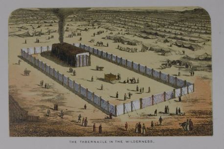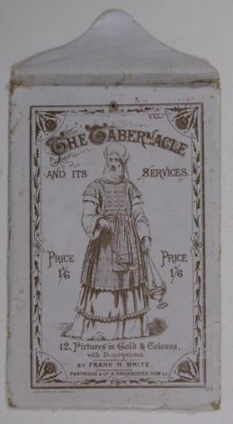 WHITE, Frank H. The tabernacle and its services. London, S W Partridge and Co, (ca. 1873).Original pictorial envelope with 12 chromolithographs embellished with gilt. The fine coloured plates show: The high priest of Israel in his robes 'glory & beauty', The high priest of Israel on the great day of atonement, The tabernacle in the wilderness, The altar of burnt offering, The laver, The scape goat the camp in the plain of Er Raheh mount Sinai (Horeb) , The table of shewbread, The altar of incense, The golden candlestick, The ark of the covenant, The golden framework of the tabernacle & the coverings, and The holy place. With booklet: Descriptive and expository notes on the tabernacle and the 'Vessels of the Ministry'. (16) pp. [Boeknr.: 38008 ]