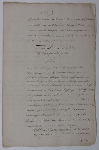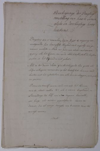 BATAVIA. Beschrijvinge der pragtige voorstelling van haare koninglijke en doorlugtige hoogheedens. Batavia, 1752.Autograph manuscript eye-witness account of the spectecular celebrations in honour of Anna of Hannover's birthday in Batavia, written in various hands. Folio. 18 lvs. Autograph manuscript, written probably shortly after or partly even during the festivities in Batavia from 2 to 6 November 1752. An eye-witness account of the spectecular celebrations, festivities, exhibitions of art, decorations and fireworks on the occasion of the birthday of Anna of Hannover (born November 2, 1709), wife of William IV (deceased the year before), daughter of George II of Great Britain, governess to her son William V (born 1748). A very interesting manuscript which, through the eyes of a number of guests invited to join the festivities, gives a detailed day by day rendering of the most important and worthwhile attractions: the dinner party given in honour of Anna of Hannover, by governor general Jacob Mossel, the decorations of the city (mentioning the Chinese revolt of 1740 which left the city in a ruined state, but this no longer shows), a survey of paintings by 'de beste meesters', a description of the 150 meters long 'Orangelaan', a special built Temple of Art and a pond. Splendour and opulence abound. An unique account of an European party in Asia. [Boeknr.: 22951 ]
