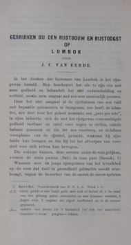 EERDE, J.C. van. Gebruiken bij den rijstbouw en rijstoogst op Lombok. (Batavia, 1902). Wrappers. (11) pp. Ex Bibl. Bali Instituut. - (Offprint TBG). - Printed in Batavia. [Boeknr.: 28740 ]