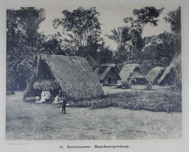 KLEYNENBERG - Julius B. MULLER. Suriname. Boschnegerdorp. Haarlem, Kleynenberg & Co, (ca. 1911). Tinted photographic plate by Julius B. Muller, depicting a Maroon village, printed on heavy paper. ca. 60 x 73 cm. From the series of school plates by J.F.Niermeyer, e.a. Platen van Nederlandsch-Oost en West-Indië en Suriname, published between 1911 and 1913. - Exquisitely printed. [Boeknr.: 37968 ]