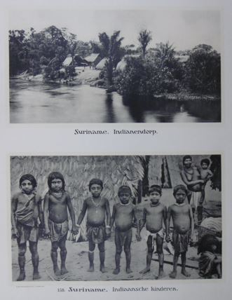 KLEYNENBERG & Co. Suriname. Indianendorp & Indiaansche kinderen. Haarlem, Kleynenberg & Co, (ca. 1911). Tinted photographic plate, depicting a Carib Indian village on a river and native American children of the Caribbean, printed on heavy paper. ca. 60 x 73 cm. From the series of school plates by J.F.Niermeyer, e.a. Platen van Nederlandsch-Oost en West-Indië en Suriname, published between 1911 and 1913. - Exquisitely printed. [Boeknr.: 37969 ]
