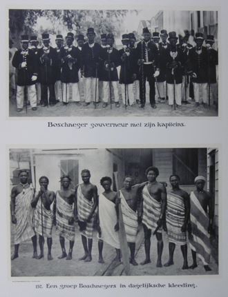 KLEYNENBERG - Julius B. MULLER. Boschneger gouverneur met zijn kapiteins & Een groep Boschnegers in dagelijksche kleeding. Haarlem, Kleynenberg & Co, (ca. 1911). Tinted photographic plate by Julius B. Muller, depicting Granman with Maroon captains in Paramaribo and several Maroons in everyday clothes, printed on heavy paper. ca. 60 x 73 cm. From the series of school plates by J.F.Niermeyer, e.a. Platen van Nederlandsch-Oost en West-Indië en Suriname, published between 1911 and 1913. - Exquisitely printed. [Boeknr.: 37970 ]