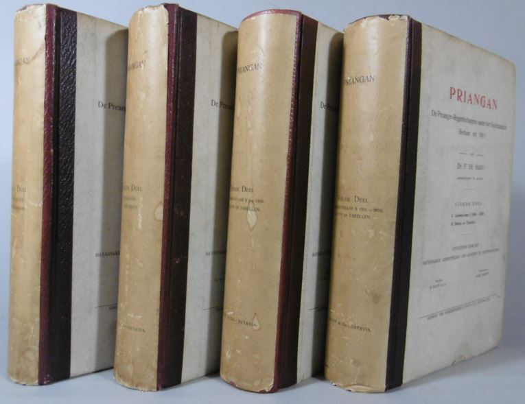 HAAN, Frederik de. Priangan. De Preanger-Regentschappen onder het Nederlandsch bestuur tot 1811. Batavia, Bataviaasch Genootschap van Kunsten en Wetenschappen, 1910-1912.4 volumes. 8vo. Original half red cloth, with paper labels to spines. With 2 maps and 44 plates and facsimiles. With armorial bookplate of W.G. Broek and label of G. Kolff & Co. boekhandel in Batavia. - One of the most detailed and best monographs Dutch colonial history has at its disposal .. F. de Haan (1863-1938) for many years carefully examined the archives for anything that could be found on the Preanger during the time of the Company. His resulting four-volume Priangan .. is not only of importance for the district mentioned in the title. Anyone who is interested in the Company's history and role on Java should possess this book because of the rich quantity of material it provides. .. De Haan, when he was Keeper of the Records at Batavia, always tried to keep visitors out of the archives so that he could devote all his attention to his beloved Priangan. (Coolhaas p.54). Vol. I gives a survey of the history of Priangan and detailed biographical data concerning all those who were of any importance to it. Vol. II contains 50 appendices, reproductions of the most important documents from the archives and 23 'excursen' (special subjects). Vol. III and IV give a very detailed commentary on the survey in vol. I as well as 32 lists and tables. It is the first major, historically responsible regional study of the VOC, not as a trading body but as a territorial authority. - A fine set. [Boeknr.: 13635 ]