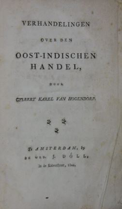 HOGENDORP, Gijsbert Karel van. Verhandelingen over den Oost-Indischen handel. Amsterdam, Wed. J. Dóll, 1801.Original wrappers, uncut (spine damaged). 189 pp. Volume I, a second volume was published in 1802. - Essays on the commerce of the East Indies, dealing with the possessions and concessions of the Dutch East India Company (VOC) in the East Indies. Van Hogendorp's (1771-1834) role in politics, that of helping to establish the Dutch monarchy following the Napoleonic period, is more generally known. - (Some waterstaining).Cat. KITLV p.146. [Boeknr.: 30846 ]
