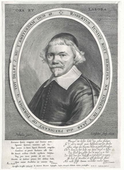 JUNIUS, Robertus. Robertus Junius Beroepen na Indien in't jaar 1628, predikant op Formosa. (Amsterdam), J. Blaeu, 1654. Engraved oval portrait by Corn. Visscher with his motto Ora et Labora at the top, below an eight line poem in Latin by A. Montanus and eight line poem in Dutch by H.F. Waterloos. Ca. 34,5 x 25 cm. Robertus Junius (1606-1655) was the second VOC missionary sent to Dutch Formosa. He served two terms on the island for a total of fourteen years. From 1633 to 1639, he served in the same area as Georgius Candidius, the first missionary on Formosa. The mission on Formosa is unique in the history of the VOC, as it was the only area of ??the Company's possessions where a church emerged among non-Christians. This was largely due to Junius's efforts. Considered in Dutch church history as the reformer of Formosa, he baptized about 5,500 adults and educated 50 primary school teachers. He proposed to send pupils to the Netherlands for theological training; he translated sermons and the Heidelberg Catechism, and emphasized the importance of teaching in the vernacular.Muller, Portetten, 2815e: 'Keurige druk'. [Boeknr.: 38016 ]
