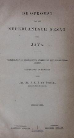 JONGE, Jan Karel Jakob de. De opkomst van het Nederlandsch gezag over Java. Verzameling van onuitgegeven stukken uit het Oud-Koloniaal Archief. Deel VI. 's Gravenhage, Martinus Nijhoff, Amsterdam, Frederik Muller, 1877. Original printed wrappers (spine sl. dam.). CI,447 pp. [Boeknr.: 34340 ]