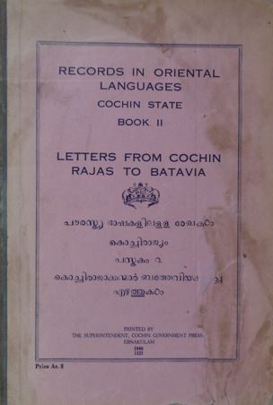 MENON, V.K.R. Letters from Cochin rajas to Batavia.. Ernaukulam, Cochin Government Press, 1946. Original printed boards (sl. soiled). 2,28 pp. Records in Oriental languages Cochin State. - Nine letters written by the rajas of Cochin to the governors-general of Batavia in Malayalam text. [Boeknr.: 38066 ]