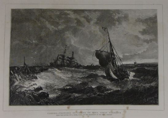 GRAPHIC. Fishing-trawlers returning to port Great Varmouth. London, The Graphic, 1876.Woodengraving after E. Hayes. Ca. 29,5 x 39 cm [Boeknr.: 37946 ]