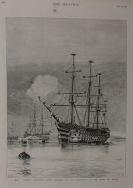 GRAPHIC. H.M.S. 'Victory' decorated with garlands on the anniversary of the death of Nelson. London, The Graphic, 1876.Woodengraving. Ca. 39 x 29,5 cm HMS Victory is a warship which served in the British Navy during the eighteenth and nineteenth centuries and played a key role in the Battle of Trafalgar, where she defeated French and Spanish ships as the flagship of Admiral Horatio Nelson. [Boeknr.: 37948 ]