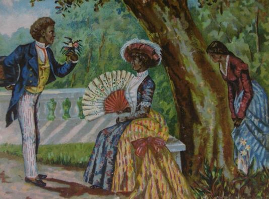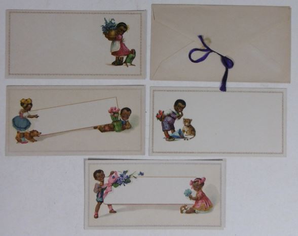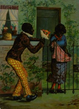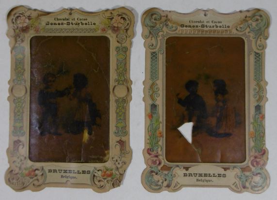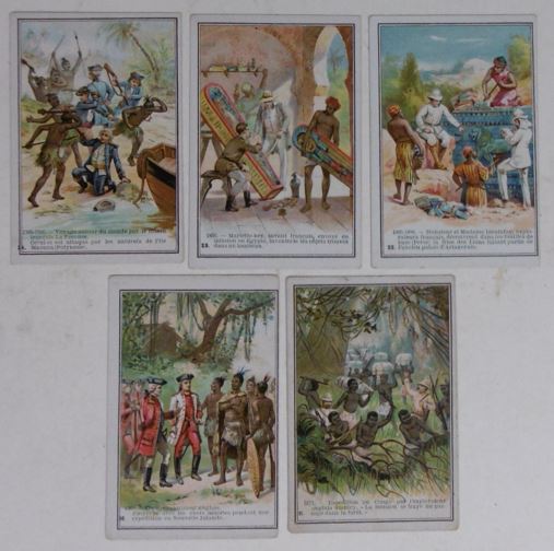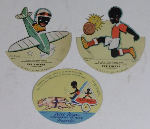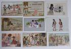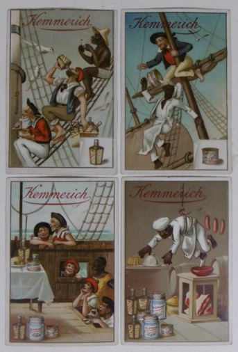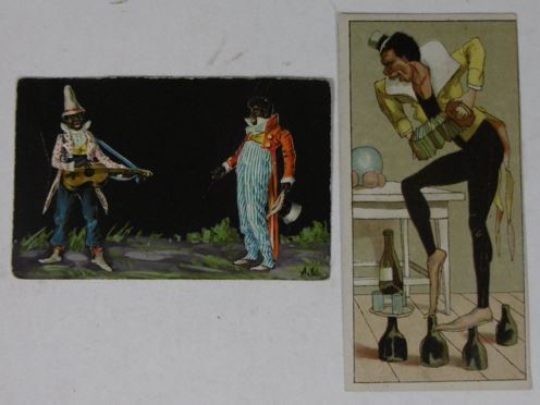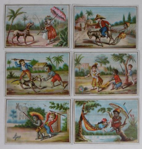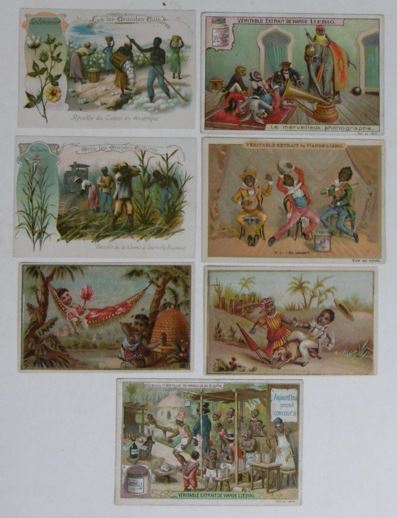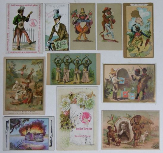 CUTS & ADVERTISING TRADE CARDS. Collection containing ca. 80 cuts for an album amicorum and 80 advertising trade cards, all depicting images of black people: minstrel dancers, caricatures, angels, heads, historical scenes, etc. (Ca. 1890). Chromo-lithographed cuts and cards. Various sizes. Advertising cards: Compagnie Leibig, Fray-Bentos (3 x); F. Thiéry & Cie, Anvers (5); 'De Gulden Bie, Antwerpen (5); Kemmerich (4); Petit Nègre Fromage Suisse (3); Dans la grandes Cultures (2); Watrelot-Delespaul (2); Chocolat et Cacao Senez-Sturbelle Bruxelles (2); & 30 others advertising cards from Chocolat Tobler Berne, Le Bios Antwerp, Les Cinghalais Bruxelles, Peek Frean & Co's Biscuits, Compagnie continentale pour la torréfaction des cafés Anvers, A la flotte française Rouen, Alcool de menthe de Ricqlès, Maison van Crombrugge Liège, Prduits alimentaires Knorr, Perles du Japon Paris, P. Moneuse & Ad. Humez Sauchy-Lestrée, A.J. Simon & Fils Bruxelles, Amidon Vermeire Hamme, A. Sonnet-Josse Charleroi, etc. Added a plate and a carte postale depicting black musicians and 3 large chromothographed plates depicting black couples and sheet with 15 mounted cuts of black heads. The full-colour scrap was produced by chromolithography from the 1860’s and early 1870’s onwards, individual subjects were presented in multiple sheets, each image held to its neighbor by narrow connecting tabs. They became a worldwide cult. - More images available upon request. [Boeknr.: 38105 ]