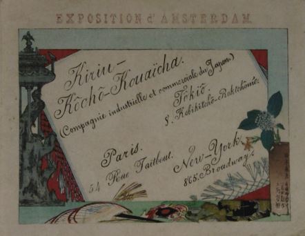 EXPOSITION D' AMSTERDAM. Kiriu-Kôchô-Kouaïcha. (Compagnie Industrielle et Commerciale du Japon). Tokiô, Paris, New York, (1883).Coloured illustrated company flyer. Ca. 12 x 15,5 cm. Issued for the Internationale Koloniale en Uitvoerhandel Tentoonstelling, The International Colonial and Export Exhibition, a colonial exhibition held in Amsterdam from May 1 to October 1, 1883. The event drew at least a million visitors and was the first international colonial exhibition, with 28 different nations presenting their colonial trade and wealth. [Boeknr.: 38027 ]