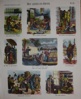 JAPAN. Het leven in Japan. (Amsterdam, De Ruyter & Meijer, ca.1900).Broadsheet with 8 coloured woodengravings depicting life in Japan. Ca. 42,5 x 34,5 cm. Meijers Prenten 4e serie. no. 92. - Catchpenny print (Dutch centsprent) is the name given to a type of cheap, mass-produced sheets printed on one side and illustrated with simple images, that were sold in the Netherlands in the eighteenth and nineteenth centuries. - Fine condition. [Boeknr.: 38024 ]