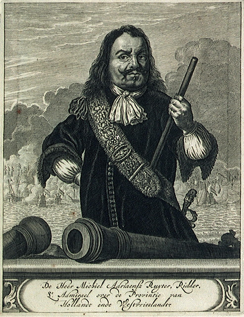 RUYTER, Michiel Adriaansz. de. De heer Michiel Adriaensz Ruyter, ridder, lt.admirael over de provintie van Hollandt ende Westvrieslandt. (Ca. 1670). Engraved portrait by Christian Hagen with two canons in the foreground and sea-battle in the background. 19,5 x 15 cm. Michiel Adriaenszoon de Ruyter (1607 - 1676) was a Dutch States navy officer. His achievements with the Dutch navy during the Anglo-Dutch Wars earned him the reputation as one of the greatest naval commanders in history. Muller, Portretten, 4642. [Boeknr.: 38114 ]