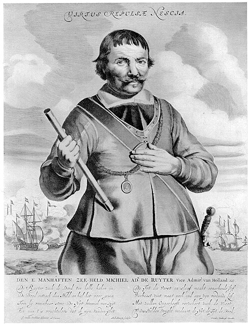 RUYTER, Michiel Adriaansz. de. Den E. manhaften zee-held Michiel Ad. de Ruyter, vice admir. van Hollandt etc. Amsterdam, Cornelis Danckertsz, (1654). Engraved portrait after G.vanden Eeckhoudt by M. Mousyn with on top motto 'Virtus Repulsae Nescia', below 2 colums with 4 lines and sea-battle in the background.. Ca. 28,5 x 20 cm. Michiel Adriaenszoon de Ruyter (1607 - 1676) was a Dutch States navy officer. His achievements with the Dutch navy during the Anglo-Dutch Wars earned him the reputation as one of the greatest naval commanders in history. Muller, Portretten, 4630 k. [Boeknr.: 38116 ]