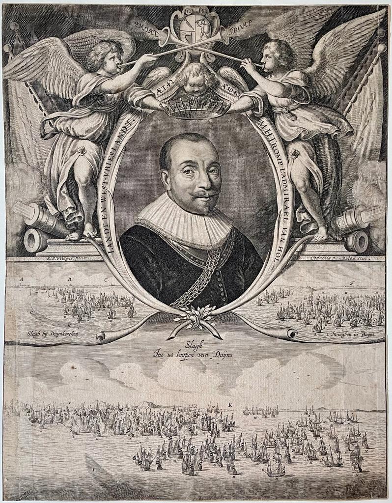TROMP, Maarten Harpertsz. M.H. Tromp l'admirael van Hollandt en West-Vrieslandt. AET 42/ a. 1640 (text aval frame). (No pl., 1640).Engraved oval portrait by Cornelis van Dalen after Simon Jacobsz. de Vlieger and Willem van de Velde I, with 2 angels playing trumpets and 3 sea battles of Duynkerken and Duyns. (Without printed text below; trimmed). Ca. 40 x 30 cm. Maarten Harpertszoon Tromp (1598 - 1653) enjoys fame as a naval hero in Dutch history. In 1610, Tromp sailed to Guinea with his father, who had by then become a merchant. En route, their ship engaged in combat with seven pirate ships. His father was killed by a cannonball, after which the ship was boarded. Tromp was enslaved in Salé and was freed after two years. The Battle of The Downs in the English Channel took place on October 31, 1639. Tromp achieved a decisive victory over a Spanish war fleet of 55 ships. The Battle of Dunkirk took place on February 18, 1639. During the naval battle, Tromp, who commanded a fleet of 11 ships aboard the flagship Aemilia, defeated a fleet of Dunkirk privateers twice their size.Cf. Muller, Portretten, 5441 e. [Boeknr.: 38117 ]