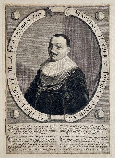 TROMP, Maarten Harpertsz. Martinus Harpertz. Trompius admirael de Hollande et de la Frise occidentale. (Text oval frame). (No pl., before 1690).Engraved oval portrait by C. Duran after Jonas Suyderhoef. With 20 lines of French text below in 2 columns. Ca. 28 x 19 cm (trimmed, mounted on board), Maarten Harpertszoon Tromp (1598 - 1653) was a son of a ship's captain and spent much of his childhood at sea, during which time he was captured by pirates and enslaved by Barbary corsairs. In adult life, he became a renowned ship captain and naval commander.Cf. Muller, Portretten, 5439c. [Boeknr.: 38118 ]