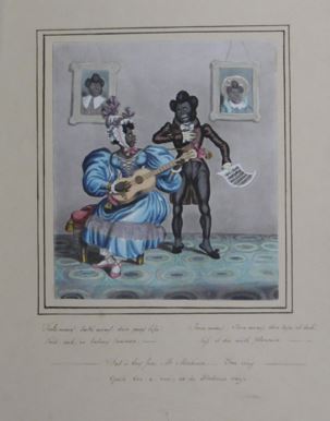 HUNT, Charles. Racist caricature of an African American couple singing and playing guitar in a parlor. In the right, "Mr Mortimer," stands with his right hand over his heart and with his other holding a sheet of music. He wears mutton chops and is attired in a brown coat with tails, a white bow tie, black pants, black stockings, black slipper shoes, and white gloves. His eyes look up and his mouth is open. He sings a love song while the woman seated in the left plays a guitar decorated with blue ribbons. Her head is turned toward the man and she sits on a bench with a red cushion. She wears a large white bonnet adorned with red and blue bows. Behind them two paintings are hanging on the wall. (London, ca. 1830) Coloured aquatint after E.W. Clay with 6 handwritten lines of dialogue in the vernacular and dialect below the image: "Take away, take away dose rosy lips, rich, rich in balmy treasure. Turn away, turn away dose eyes ob lub, less I die wid pleasure. Dat is bery fine, Mr. Mortimer, you sing quite con a moor, as de Italians say'. Ca. 18,5 x 16 cm. This racist cartoon satirizing middle-class African-Americans in Philadelphia, is part of a series capturing Life in Philadelphia, with a scene focusing on expressions of local social and cultural dynamics in the city's community. - Scarce. [Boeknr.: 38033 ]