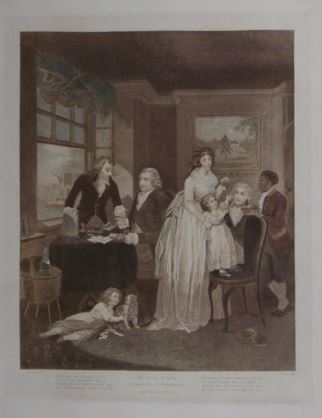 MORLAND, George. The fruits of early industry & oeconomy. London, T. Simpson, 1789.Large mezzotint engraving after George Morland by William Ward with below two, four line poems, by Samuel Collings. Ca. 46 x 35 cm. Beautiful image after the painting made in 1789 by George Morland (1763-1804), one of the most successful genre painters of his time. 'The title of this fictional scene implies that the diligent oversight of the businessmen-presumably owners of the dockyard outside the window and the country estate over the mantel-has enabled the family to enjoy richly patterned carpets, wine, and glassware. The young Black servant holding a basket of fresh fruit is a reminder of how much British wealth depended on enslaved labor and the slave trade in this period. African servants were considered a mark of social status at the time, and the presence of such a figure in this picture draws attention to disparities of power, privilege, and income' (Philadelphia Museum of Art). [Boeknr.: 37789 ]